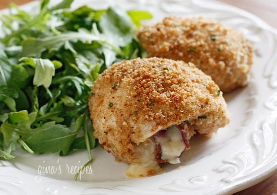 Chicken cutlets dipped in lemon and olive oil, gently coated in a combination of bread crumbs and romano cheese then rolled with prosciutto, cheese and red onion and baked until golden. Serve this with a simple arugula salad or tomato salad for a complete dinner.
