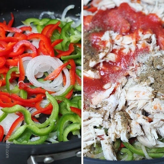 - In a large deep skillet, heat the olive oil over medium heat. Add the remaining garlic, sliced onions, green peppers, and red peppers. Cook about 3 to 4 minutes, or until soft.