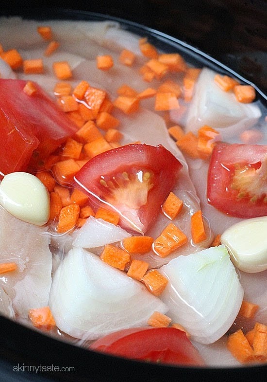 - Place chicken, bell pepper, tomatoes, carrots, and half of garlic into the slow cooker. Add just enough chicken broth to cover the chicken and vegetables and add the bay leaves. Cook high for 4 hours, or low 6 to 8 hours, until the chicken is tender.