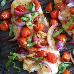 Chicken with roasted tomato, red onion, garlic and herbs adds tons of flavor to this simple dish. Adding a pinch of red pepper flakes adds just a touch of heat, while the basil adds freshness to this easy, weeknight chicken dish.