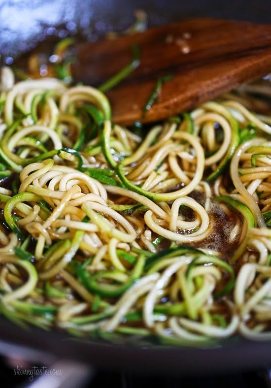 Since zucchini releases a lot of water as it cooks, I use it to my advantage and purposely leave the sauce a little thick. Once the noodles cook and release their liquid (I only cook them 2 minutes TOPS) the liquid from the zucchini thins the sauce and it comes out perfect.