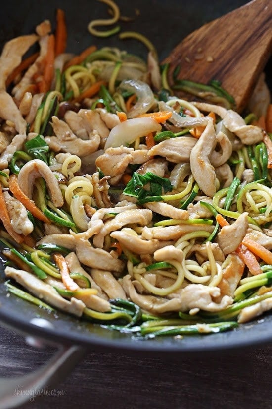 This faux lo mein dish is made with zoodles (zucchini noodles) in place of noodles and the results are DELISH (and bonus under 300 calories)! Each bowl is loaded with chicken and vegetables in a savory sauce. If you want to make this meatless, tofu would also be great in this dish. Start to finish this takes about 20 minutes to make… quicker than waiting for your take-out to get delivered!