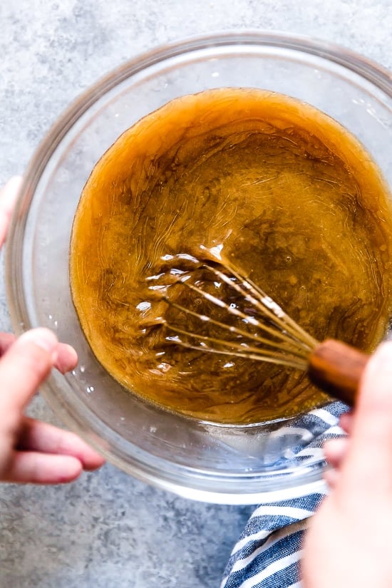 - In a large bowl add the soy sauce, chicken broth, cornstarch, mirin, sugar, and sesame oil and whisk until everything is completely dissolved.