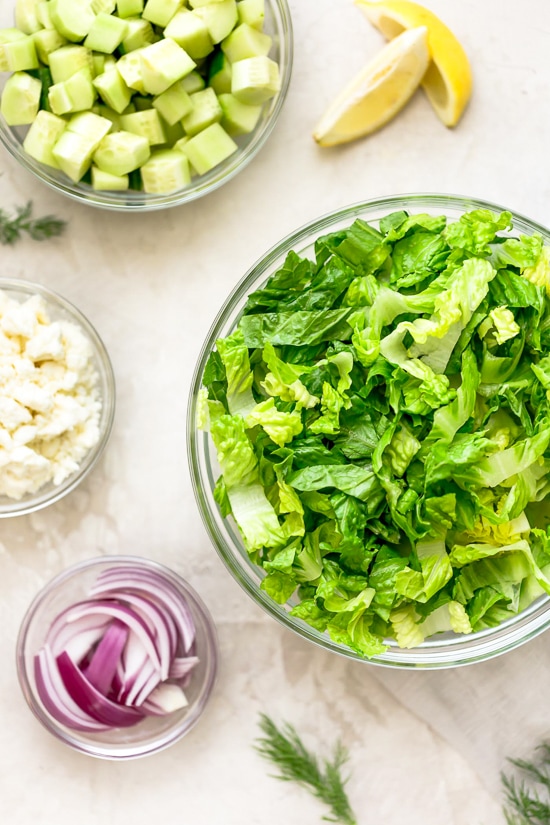 Chopped salad with romaine lettuce, Feta cheese, cucumbers, red onion and dill tossed with a simple red wine vinaigrette. An easy side salad to go with all your Mediterranean dishes.