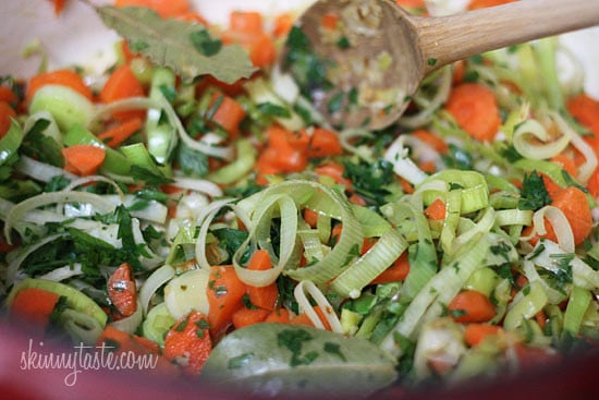 - Add leeks and sauté until soft, about 4-5 minutes; add garlic, carrots and yellow pepper and sauté about 2-3 minutes.