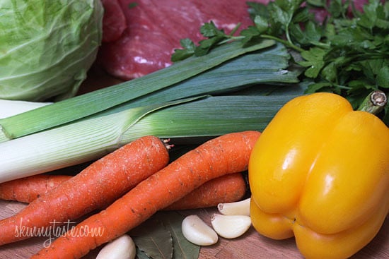 - In a skillet heat oil over medium low heat, add leeks and sauté until soft, about 4-5 minutes; add garlic and cook 2 minutes. Transfer to the slow cooker with the carrots, yellow pepper, corned beef, potatoes, peppercorns or seasoning packet that comes with the corned beef, bay leaves, parsley and water.