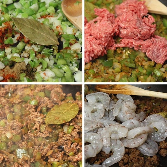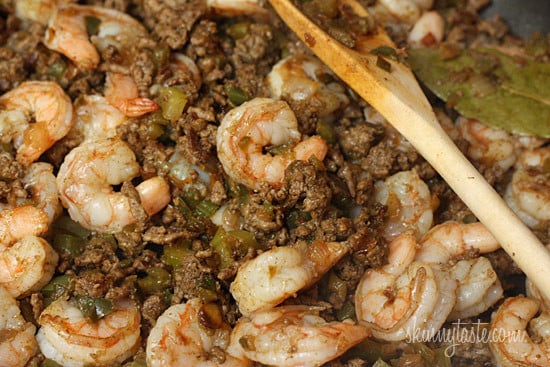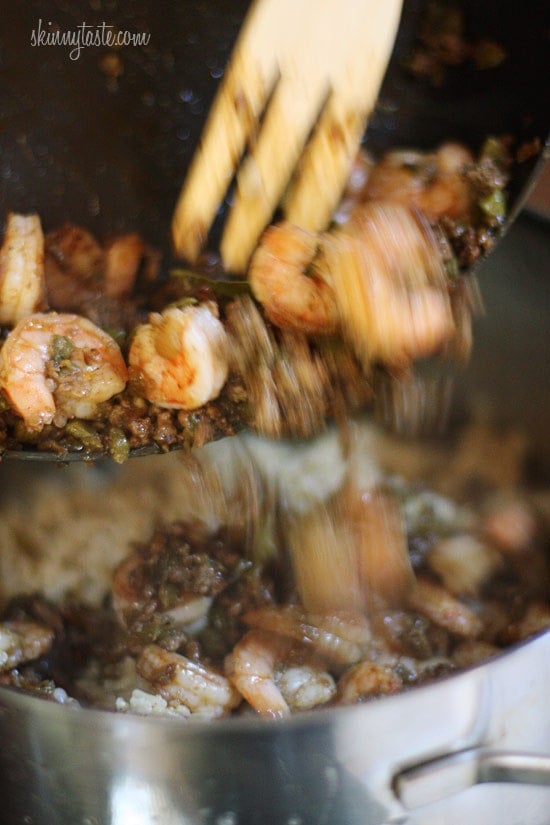 Normally a rice dish like this if made with white rice would be cooked all in one pot, but after several attempts to perfect this I found that cooking the brown rice all together created an unpleasant mushy texture. By cooking the brown rice separate, the texture of the rice was perfect when mixed with the beef and shrimp and made a delicious main dish even my “non-brown rice eating” husband enjoyed.
