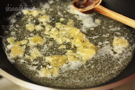 - Melt butter in a small pan, add oil and half the garlic; sauté on low heat about 1 minute.