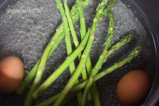 - When 2 minutes of cooking time remain for the eggs drop the asparagus into the pot of simmering water to cook.
