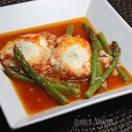 Eggs poached in chicken broth and filetto di pomodoro with asparagus topped Pecorino Romano. This is perfect for lunch or dinner, use a spoon or bread to soak up all the yummy broth!