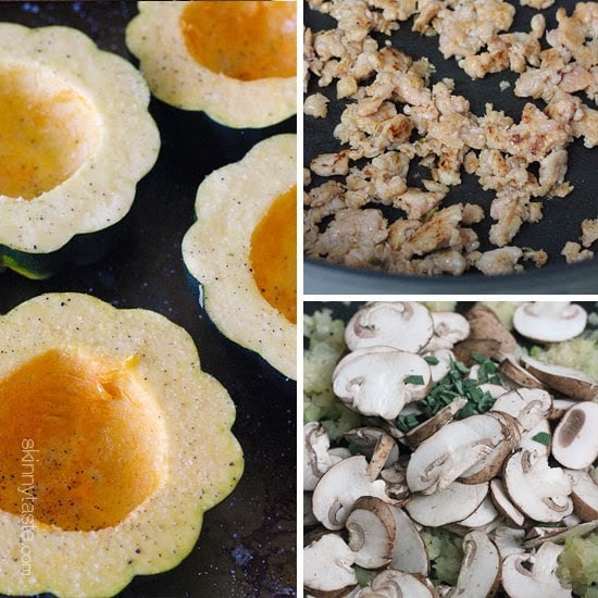 And it’s so easy, simply halve and hollow out acorn squash, then season with salt and roast in the oven. Nothing like warming up the kitchen on a blistery night with baked squash in the oven. While that bakes make the stuffing on the stove, then when the squash is ready fill it with the stuffing and serve – the results are a soft, flavorful squash filled with savory goodness!