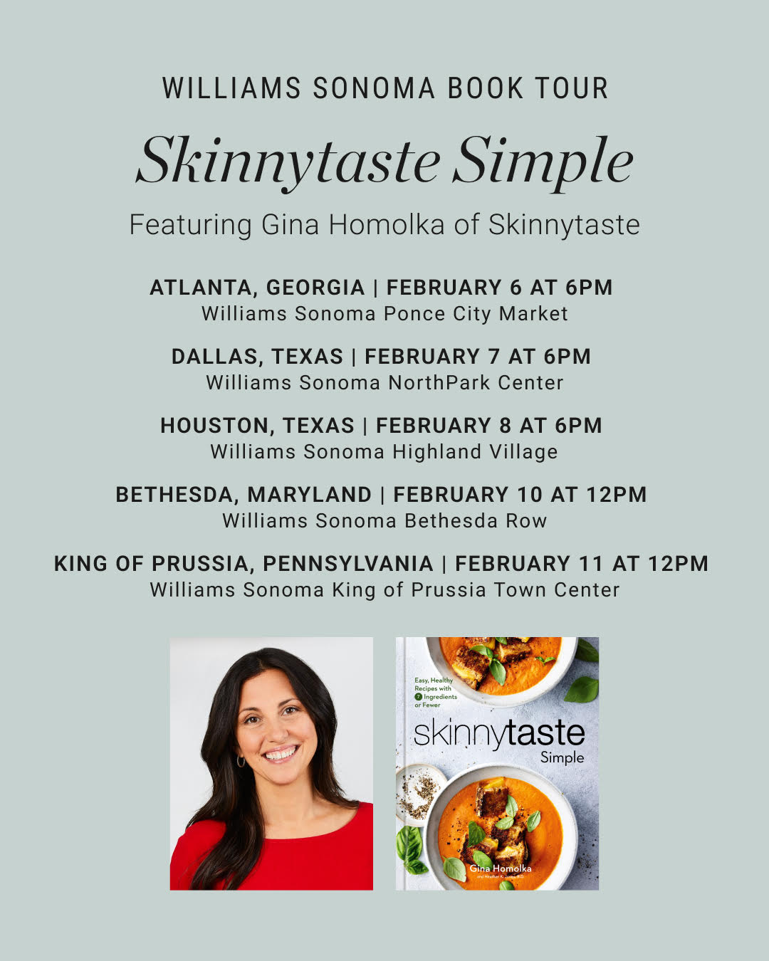 I hope everyone stayed warm this week! I have great news, I am doing a book tour for Skinnytaste Simple with Williams Sonoma and I will be traveling to Atlanta, Dallas, Houston, Washington DC, and King of Prussia, PA February 6 to February 11. Get your tickets here to reserve your spot! I hope to meet you all there!