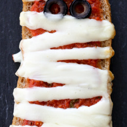 These EASY French bread pizza mummies are perfect for your next Halloween party, for kids or adults! Just 4 ingredients and about 15 minutes to make!