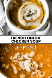 There’s something undeniably comforting about a hot bowl of French onion soup. This main dish soup takes my classic French Onion Soup recipe and adds extra protein with chicken and bone broth (40 grams protein) and it’s delicious! My husband loved it! If you love those flavors, I also have this French Onion Chicken Skillet dinner with the same flavors, minus the broth!
