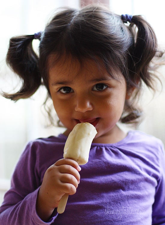 - Cut banana in half lengthwise, then in half to make four quarters. Insert popsicle sticks into bananas, and freeze bananas on a wax paper lined cookie sheet.