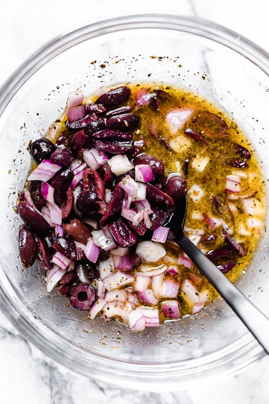 - Add the olives, red onion and brine from the olives and mix to combine.