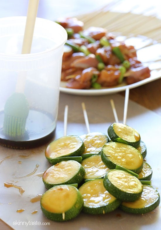 These Japanese-inspired grilled chicken yakitori skewers are made with boneless chicken thighs and zucchini, marinated in yakitori sauce, and threaded onto skewers with green onions.