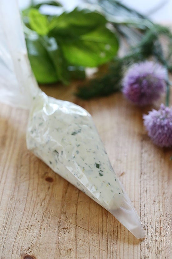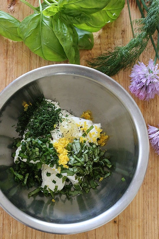 The herb cream cheese is so flavorful, with all my favorite garden herbs. You can use any combination you wish. Here I used dill, chives and basil with a little lemon zest to brighten it.