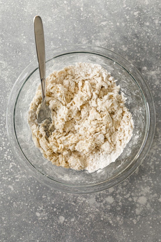 - In a medium bowl combine the flour, baking powder and salt and whisk well. Add the yogurt and egg yolks (not the whites) and mix well with a fork until well combined, it will look like small crumbles.
