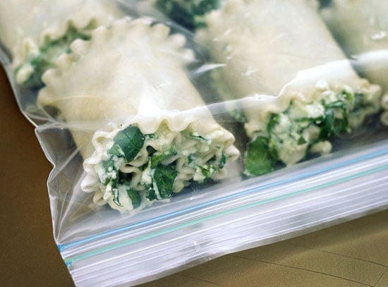 - Individually frozen – Follow the assembly directions but instead of preparing it in a 9×13 pan, skip to assembling the rolls and then flash freeze them on a cookie sheet. Once they are mostly frozen (30 minutes to 1 hour), place them gently in a freezer bag and freeze. To serve: Place 1 cup of tomato sauce in the bottom of a 9×13 pan (or adjust if making a smaller portion), place frozen lasagna rolls in the dish. Ladle sauce over the noodles in the baking dish and top each one with 1 tbsp mozzarella cheese. Put foil over baking dish and bake at 350 for 60 minutes (1.5x the originally listed bake time), or until cheese melts.
