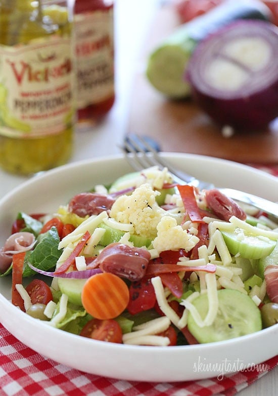 Once in a while, when we order take-out from our local pizzaeria and I prefer to have a salad, I usually get the antipasto salad. But don’t be fooled, sometimes those salads can be more calories than the pizza! So I created my own, lighter Antipasto salad which is so easy, chances are you probably already have most of the ingredients.
