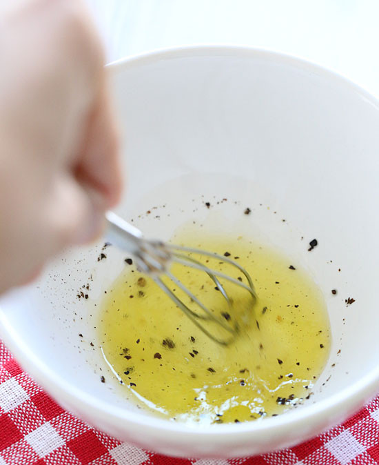 - In a small bowl add vinegar or brine from pepperoncini, add black pepper and whisk in oil.