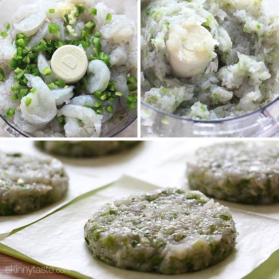 - Using rubber gloves (easier with gloves), form shrimp into 4 patties.