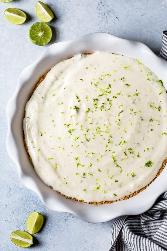 Traditional key lime pie typically uses condensed milk and is really high in calories, fat and sugar. I’ve been getting requests for a makeover, so I played around with this healthier version using yogurt and cream cheese and loved the results! I always have a couple Stonyfield Organic Yogurt quarts in my fridge because I use the yogurt throughout the week, whether I’m having it for breakfast, whipping up a batch of homemade waffles, making my favorite Street Cart Chicken and White Sauce or using it as a healthy alternative for oil, butter, sour cream and even mayo. Stonyfield Organic offers plain yogurt in fat free, low fat and whole milk. For this recipe, I used their 0% fat Plain Yogurt, which is so creamy and perfect in this pie.