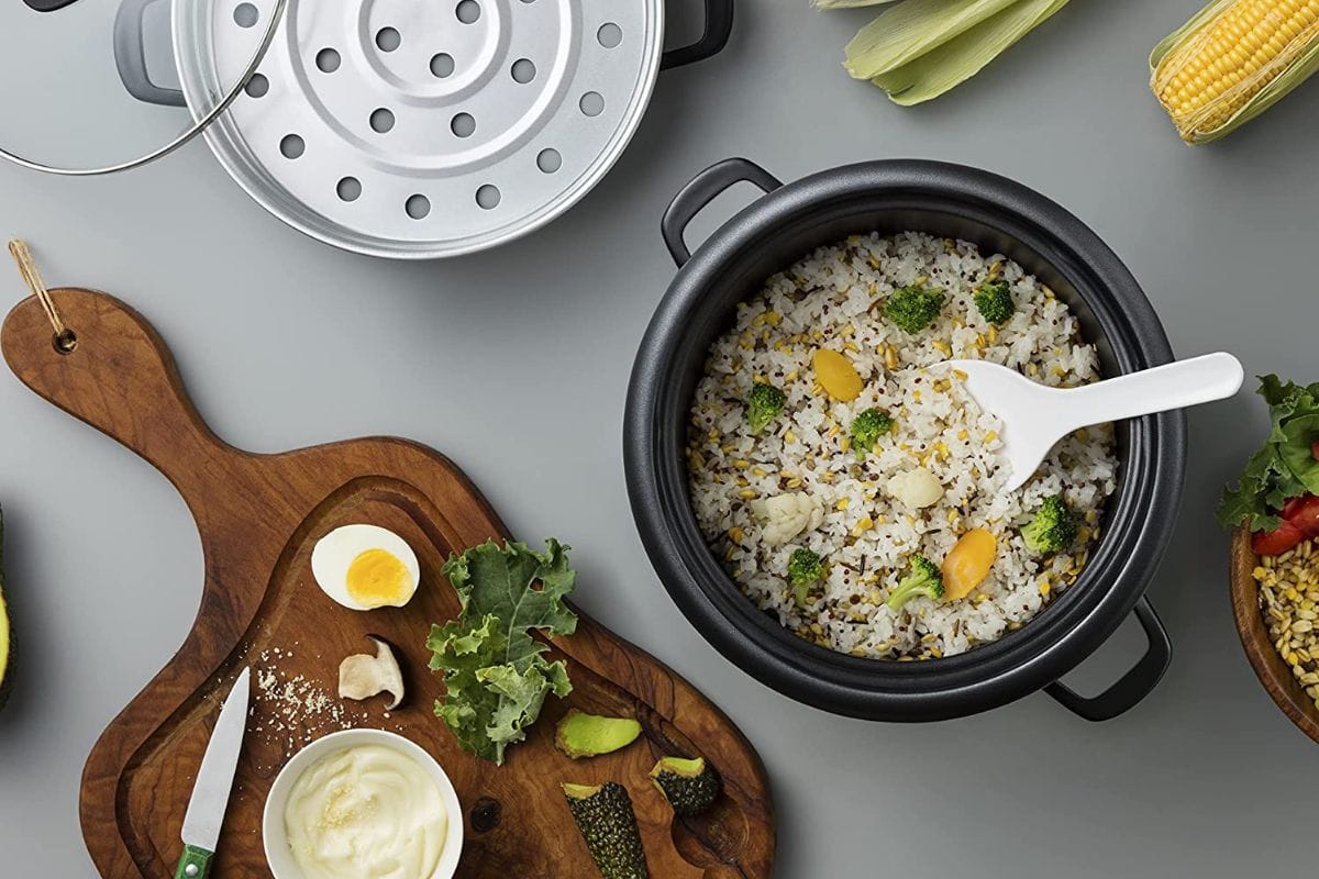 This cute appliance has a convenient 2-in-1 design that makes eating healthy a breeze! It can cook up to six cups of rice, but it also includes a steam tray that you can use to cook vegetables, fish, and more without any oil. It’s incredibly easy to operate with just one button, and you could cook a whole meal in it without ever lifting a finger.