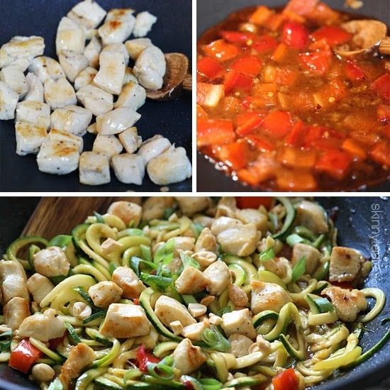 - Reduce heat to medium, add sesame oil, garlic and ginger to the skillet and cook until fragrant, about 30 seconds. Add the bell pepper, stir in soy sauce mixture and bring to a boil; reduce heat and simmer until thickened and bubbling, about 1-2 minutes. Stir in zucchini noodles and cook, mixing for about two minutes until just tender and mixed with the sauce. If it seems dry, don't worry the zucchini will release moisture which helps create a sauce. Once cooked, mix in chicken and divide between 2 bowls (about 2 cups each) and top with peanuts and scallions.