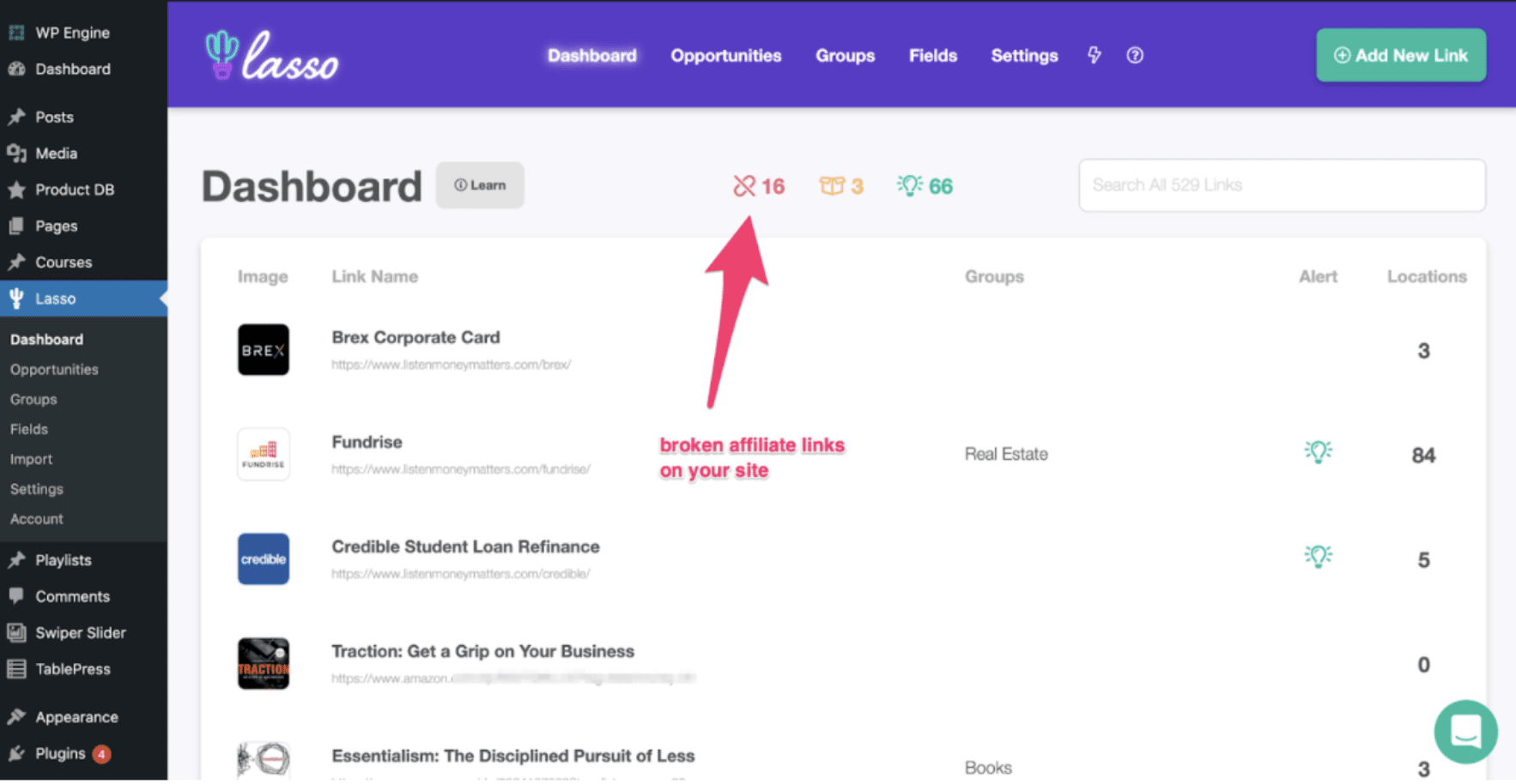 With the Lasso dashboard (which is right on your website, so no need to log in to anywhere separate), you can monitor all of your affiliate and product links in one place. When heading over to Lasso’s dashboard, you’ll see a screen displaying: