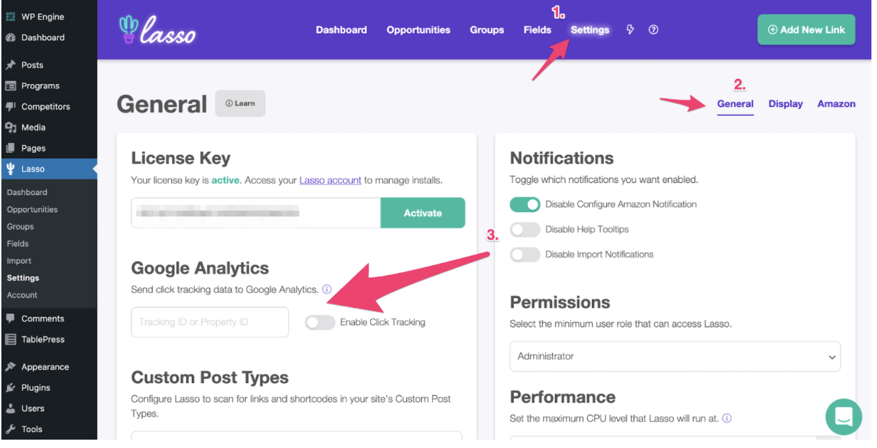 In your Lasso Dashboard, head to Settings > General and then paste your Analytics Tracking ID into the field. Next, click “Enable Click Tracking.”