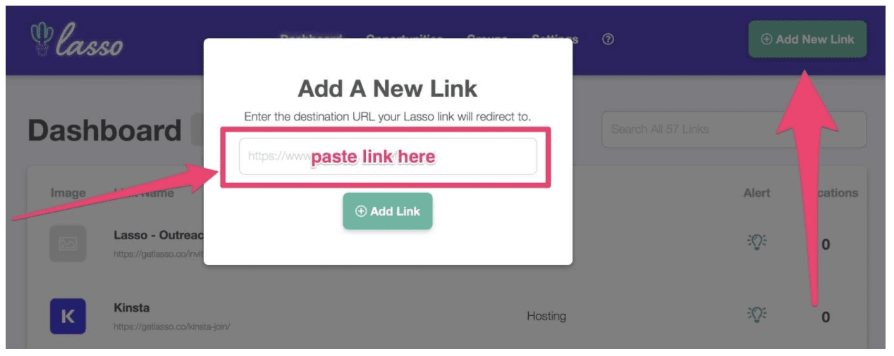 Then, head to Lasso and click “Add New Link” and paste the URL into the dashboard: