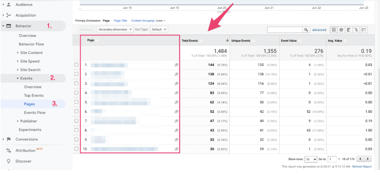 This shows you descending order from highest to lowest, every blog post and page with the highest number of clicks (i.e., an Event).