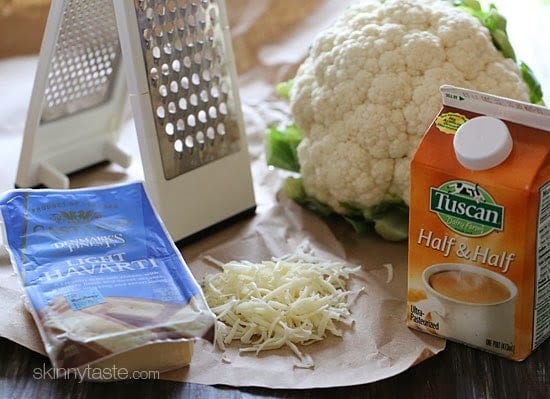 This super simple and easy to make cauliflower gratin uses light Havarti cheese, a splash of half and half, breadcrumbs and some seasoning for a delicious quick side.