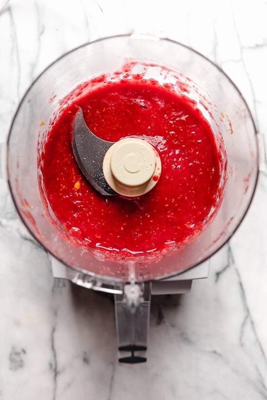 - In a blender or food processor, blend the mango until smooth. Transfer the mango to a bowl and set it aside. Add the raspberries and sugar to the blender and blend until smooth. (It is important to blend the raspberries with the sugar, as the sugar helps liquefy the berries.)