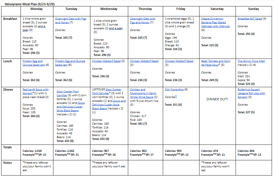 Breakfast and lunch Monday-Friday, are designed to serve 1 while dinners and all meals on Saturday and Sunday are designed to serve a family of 4. Some recipes make enough leftovers for two nights or lunch the next day. While we truly believe there is no one size fits all meal plan, we did our best to come up with something that appeals to a wide range of individuals. Everything is Weight Watchers friendly, I included the updated Weight Watcher Freestyle Points for your convenience, feel free to swap out any recipes you wish or just use this for inspiration!