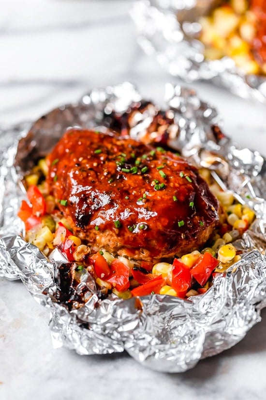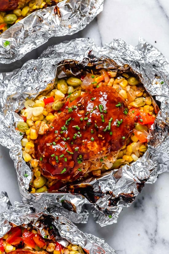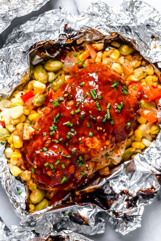 These Campfire Meatloaf Foil Packets are great for camping, glamping or for an easy weeknight dinner made with turkey meatloaf, BBQ sauce and succotash.