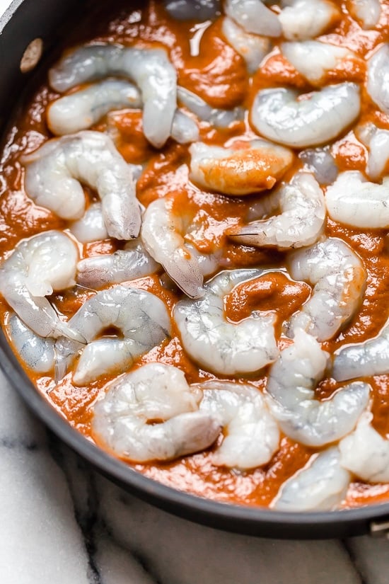 - Transfer the sauce from the blender to the skillet and add the shrimp. Coat the shrimp with the sauce and allow them to cook in the sauce until cooked through and sauce has thickened a bit, about 5 minutes.
