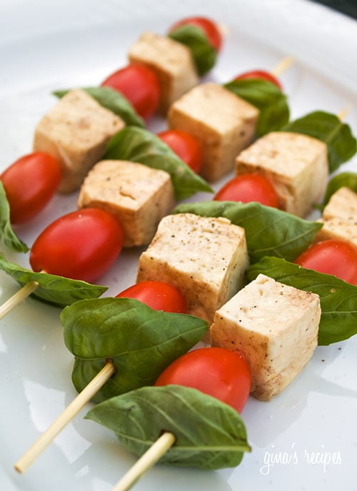 - 1 lb fresh mozzarella, cut into 32 1-inch cubes