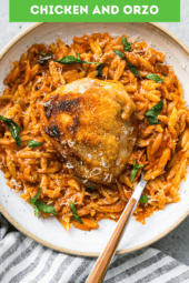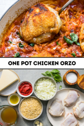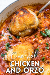 In this One-Pot Chicken and Orzo recipe, crispy chicken thighs cook right on top of the orzo in a garlicky tomato sauce with basil. It’s simple to make, serve it straight from the oven with your favorite side salad.