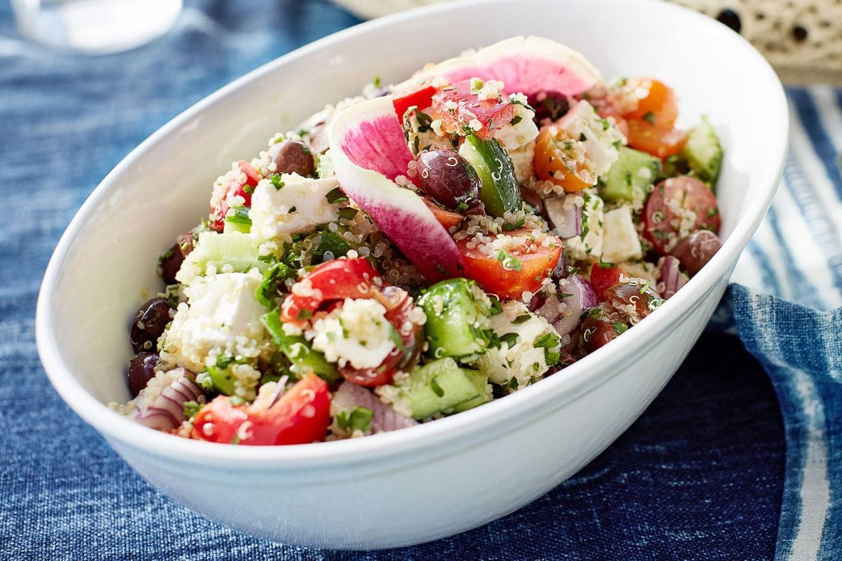 This large serving bowl is perfect for serving up my delicious Mediterranean Quinoa Salad to a crowd. The oval is easier to fit around plates and other serving dishing on a crowded patio table, and it can hole up to 3.25 quarts of food. I also love that it looks like ceramic, but it’s actually made of melamine, so it’s a bit more durable if it were to be dropped or scratched. It comes in three color options, too!