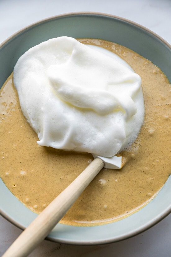- Beat the egg whites to soft peaks in another medium bowl. Then fold into the batter.