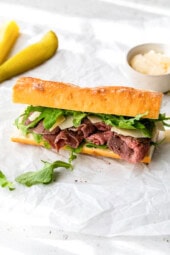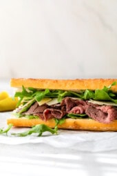 This Roast Beef Sandwich with Arugula and Shaved Parmesan on a crusty baguette is my go-to, perfect for lunch on the go!