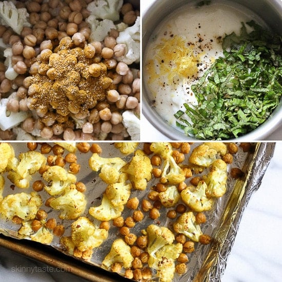 In an effort to still enjoy the flavors yet lighten things up a bit, I decided to create this roasted cauliflower and chickpea dish with minty yogurt. It’s great for lunch or as a side dish with dinner. I added a touch of sugar to the yogurt because I think the sweetness balances out the flavors. The lemon zest and mint really brighten things up and I like the contrast between the cold yogurt and the warm cauliflower and chickpeas. I hope you like it too!