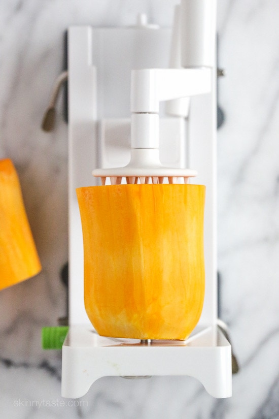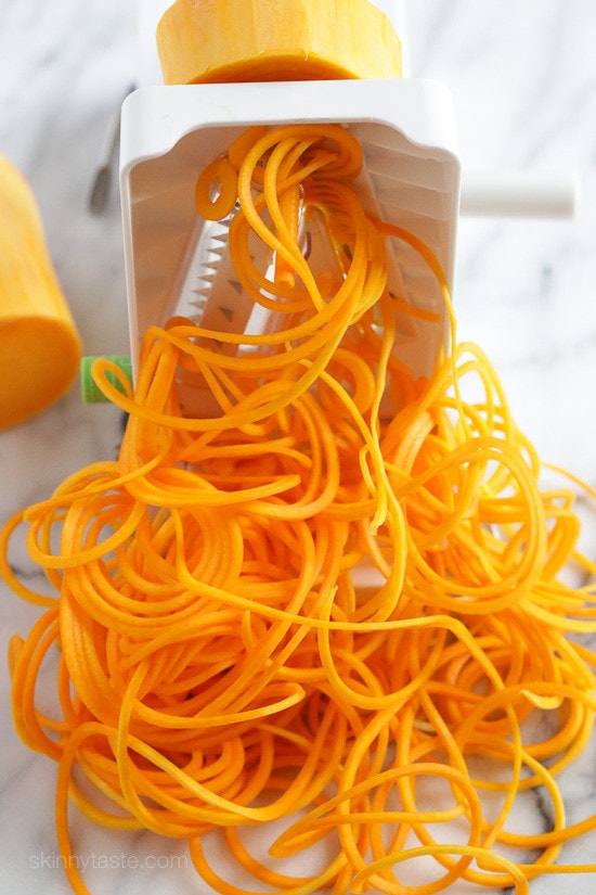 The top straighter part of the butternut is the only part that can be spiralized as the bottoms part with seeds is not solid and therefor it would not work. Save the bottom part for Roasted Butternut and Brussels Sprouts, Butternut Breakfast Burrito Bowls, or to add to these Vegetarian Butternut Enchiladas. For this recipe you’ll need one large butternut for two people. The top part that gets spiralized should be about 20 ounces once trimmed and peeled.