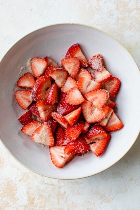 - Roast the Strawberries: Sprinkle two tablespoons of sugar over the strawberries. Place the berries on a parchment paper-lined baking sheet in a single layer and roast for 25 minutes at 375°F until the strawberries release their liquid and caramelize.
