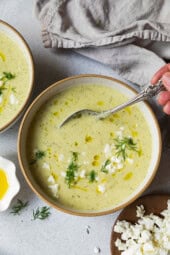 This easy Roasted Zucchini Feta Soup is roasted in the oven then blended until smooth and creamy. You can enjoy this soup hot or cold, making it perfect for summer.