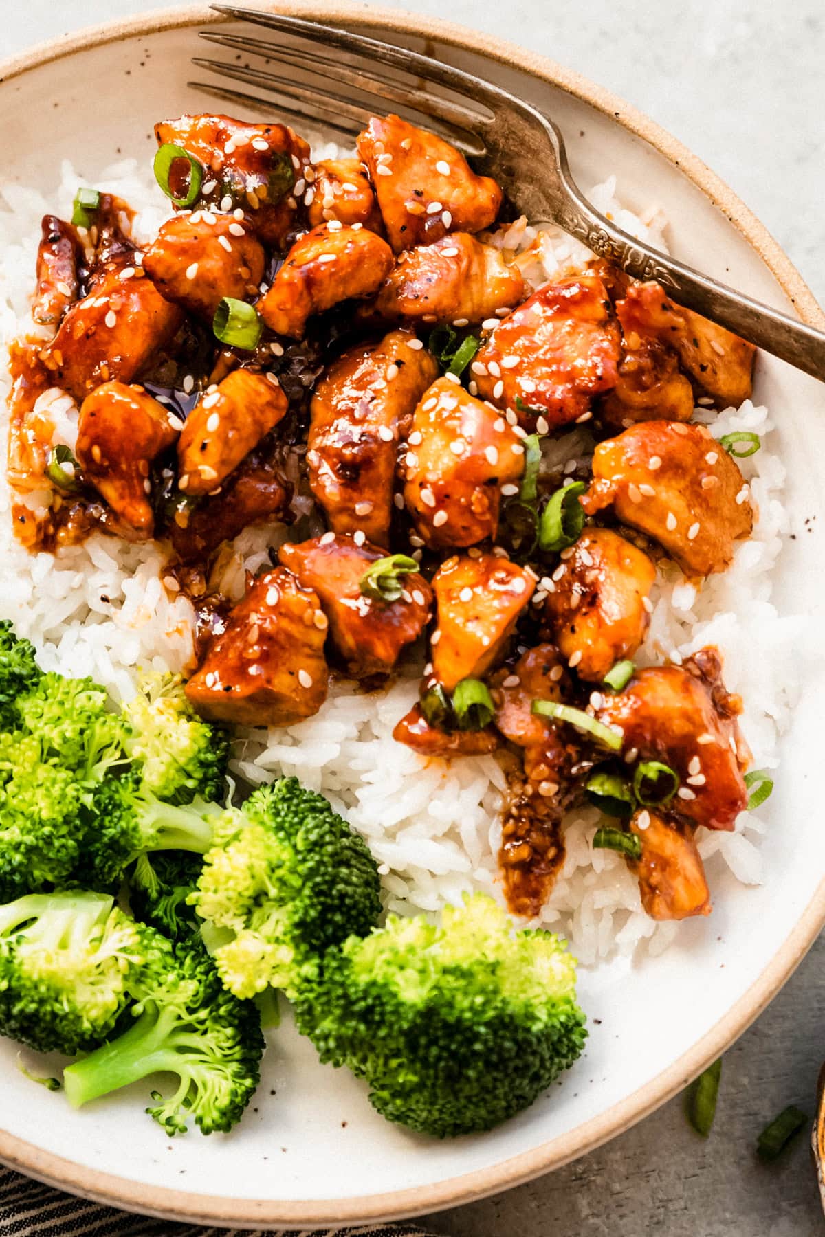 Sesame Chicken, known for its battered and deep-fried chicken and sweet- savory flavor profile, is popular in Chinese-American cuisine. It’s typically high in sugar, calories and carbs thanks to the sauce and deep frying. My lighter take uses chicken breasts, a sugar-free substitute, and just enough oil to get it crisp. Then, the chicken is coated in a glossy, sticky sauce and finished with a generous sprinkle of toasted sesame seeds and sliced green onions. This recipe includes the rice, but you can also swap it for brown fried rice or cauliflower fried rice to make it feel more like Chinese takeout. Tommy loves sesame chicken and gave my healthier version two thumbs up! More healthy Chinese-inspired dishes you should try are Kung Pao Tofu, Broccoli Beef, and Orange Chicken.