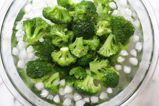 - Drain and immediately place broccoli in a large bowl of ice water to stop it from cooking.